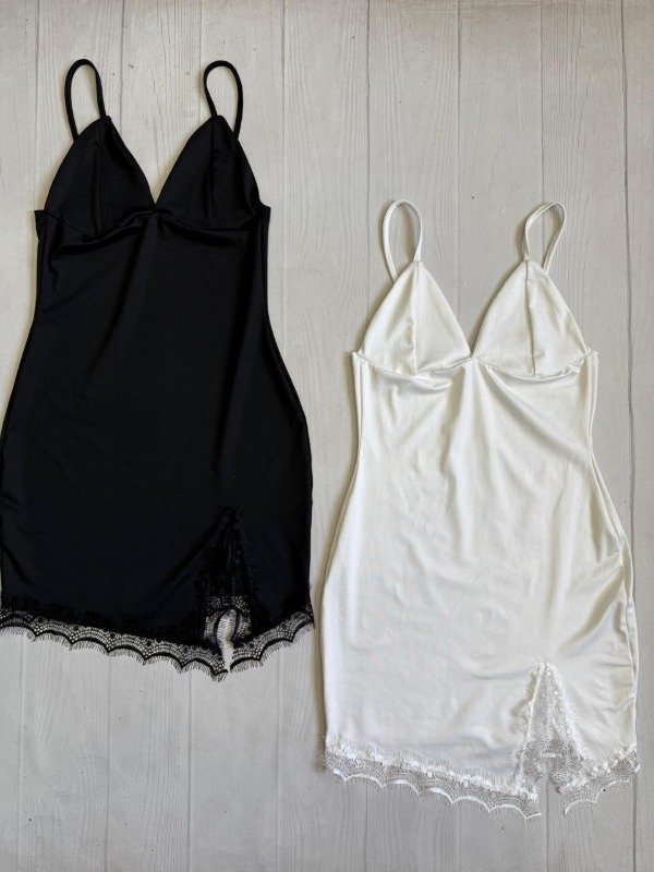 [7987] Vestido bretel V tajo y puntilla lencero microfibra
